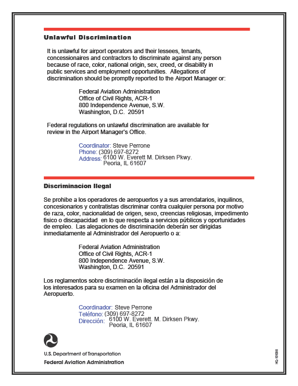 The Metropolitan Airport Authority of Peoria (MAAP) Community Participation Plan’s purpose is to ensure that stakeholders or communities affected by MAAP projects or operations can be informed and participate and have their input thoughtfully considered in the key stages during airport planning efforts, regardless of their race, color, national origin, sex, sexual orientation, gender identity, creed, age, or disability. View Full Plan